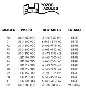 Con una ubicación privilegiada al pie de las Sierras de las Ánimas, nuestras 12 chacras están diseñadas para ofrecerte una experiencia única de conexión con el entorno natural. Ubicadas estratégicamente sobre un camino vecinal con ingreso individual y electricidad en la puerta. Disfrutarás de la comodidad y la accesibilidad sin sacrificar la tranquilidad y la privacidad que buscas en tu refugio con la naturaleza.